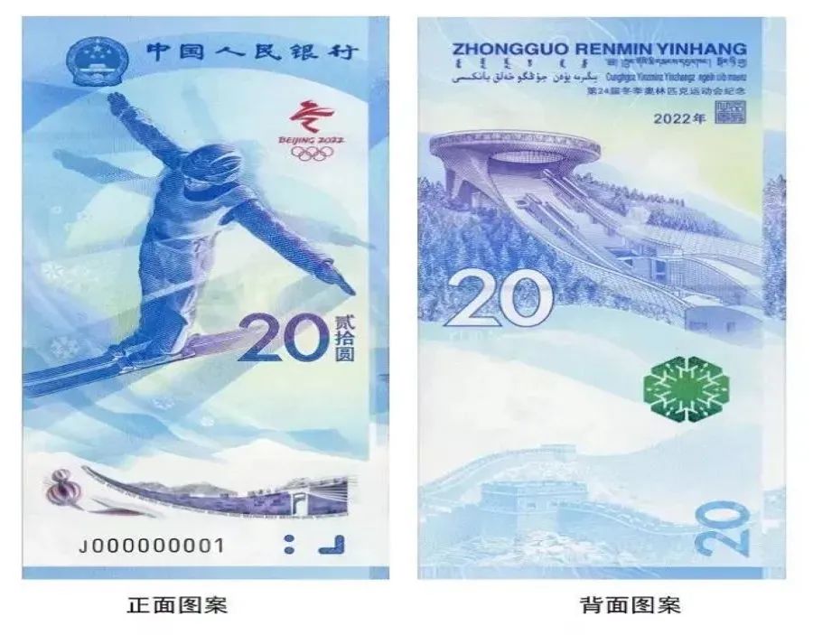 2.背面图案:背面主景为第24届冬季奥林匹克运动会竞赛场馆“雪如意”图案,上方为“中国人民银行”汉语拼音,蒙、藏、维、壮4种民族文字的“中国人民银行”字样及面额,“第24届冬季奥林匹克运动会纪念”、年号“2022年”和行长章,左侧为面额数字“20”、汉语拼音字母“YUAN”,下方为光彩光变雪花图案、雪山长城图案与面额数字“20”。