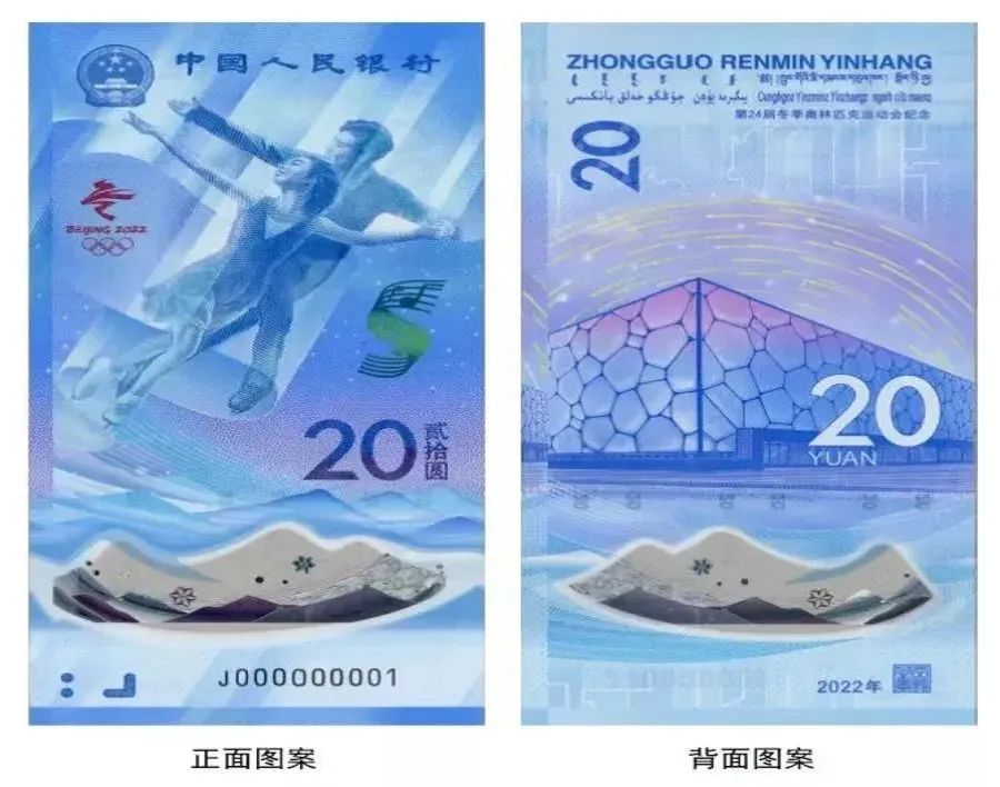 1.正面图案:正面主景为花样滑冰运动员图案,上方为中华人民共和国国徽、“中国人民银行”行名,左侧为第24届冬季奥林匹克运动会会徽,右侧为光彩光变乐谱图案、面额数字“20”与汉字“贰拾圆”,下方为动感全息图案、透明视窗、盲文面额标记和冠字号码。