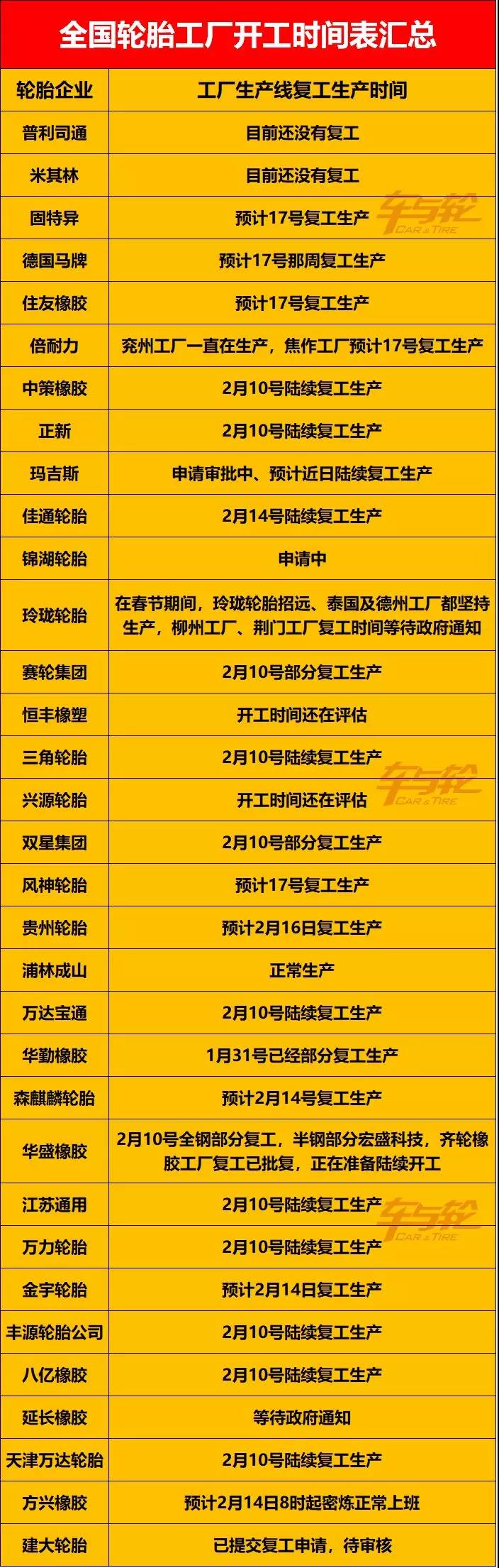 全国轮胎工厂开工时间表汇总