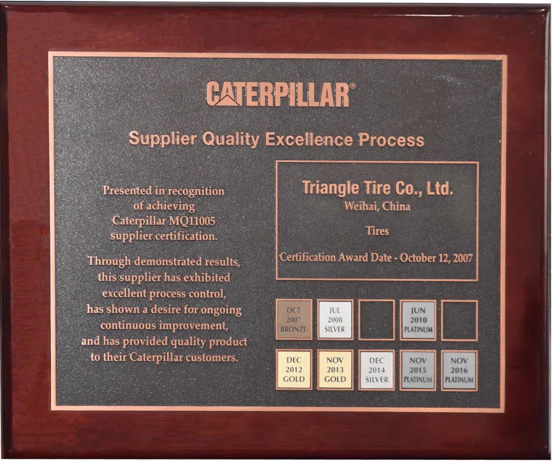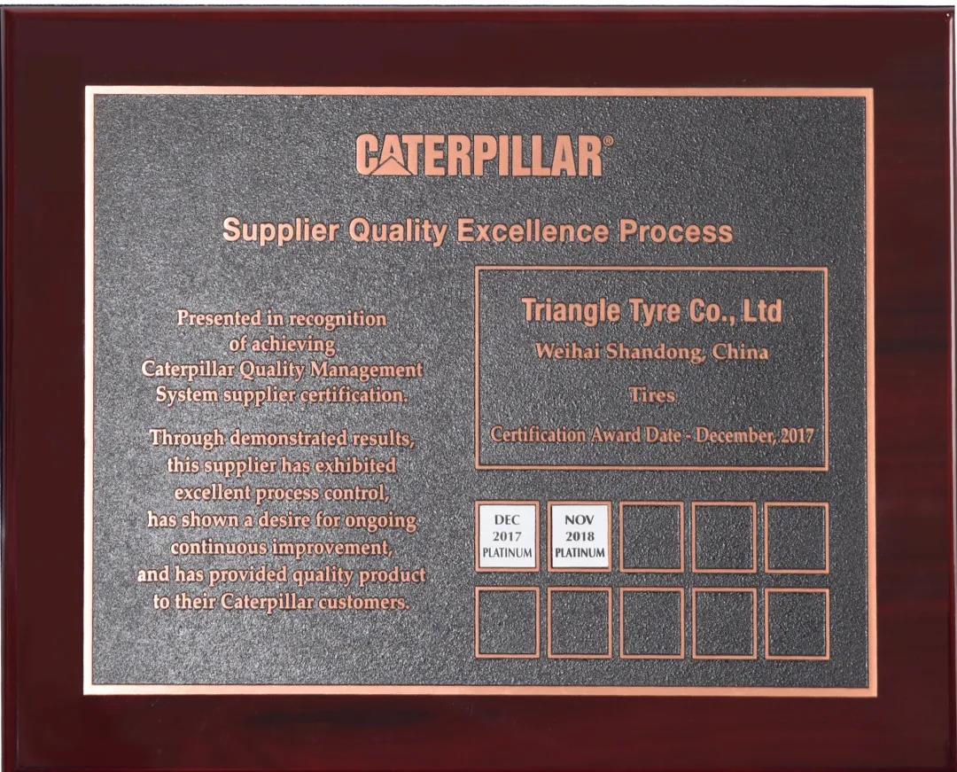 3月4日,三角轮胎获卡特彼勒公司优秀供应商质量认证(SQEP)最高等级奖——铂金奖,这已是三角轮胎第七次获得该项殊荣。