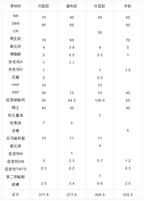 (3)补强剂和填充剂:半补强炉黑和通用炉黑和高耐磨炉黑并用效果较好,也可配适量的通用炉黑,用量可略低于内层胶和外层胶。填充剂碳酸钙、陶土粉为主。