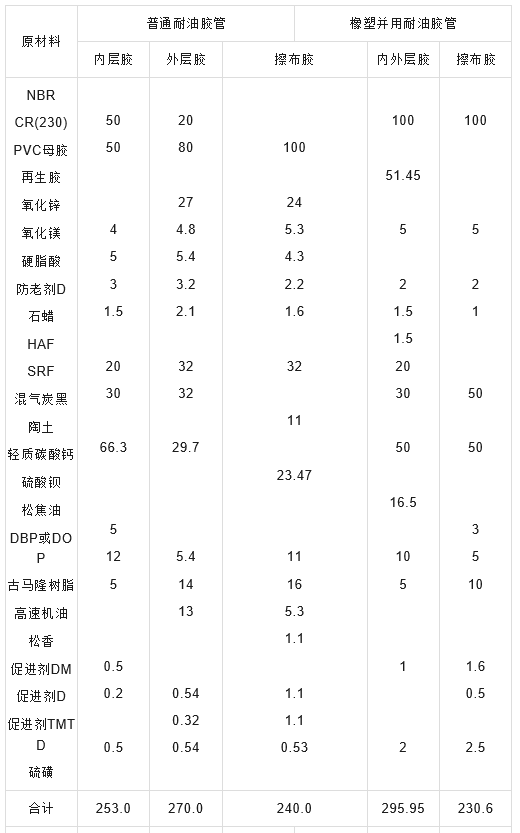 耐油胶管各部件胶料配方