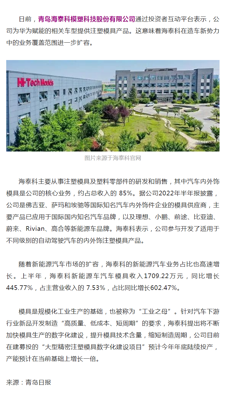 聚焦 | 海泰科为华为赋能车型提供注塑模具产品
